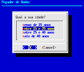 dialog \ --title 'Pergunta' \ --radiolist 'Há quanto tempo você usa o Vi?' \ 0 0 0 \ iniciante 'até 1 ano' on \ experiente 'mais de 1 ano' off \ guru 'mais de 3 anos' off