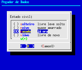 | radiolist | Vê uma lista de opções e escolhe uma |