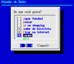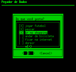 dialog \ --title 'Seleção dos Componentes' \ --checklist 'O que você quer instalar?' \ 0 0 0 \ syntax 'Arquivos de sintaxe' on \ mouse 'Suporte a mouse' off \ color 'Suporte a cores' on \ beep 'Driver avançado de som' off
